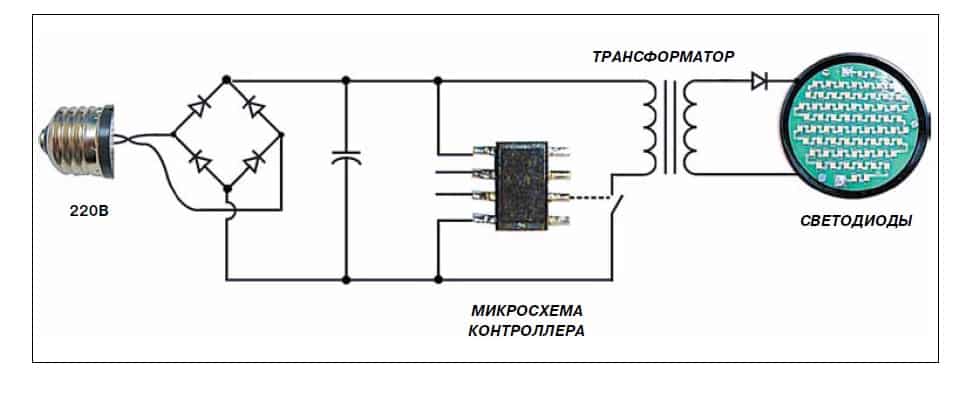 Принцип действия светодиодной лампы заключается в такой последовательности передачи электрической энергии: