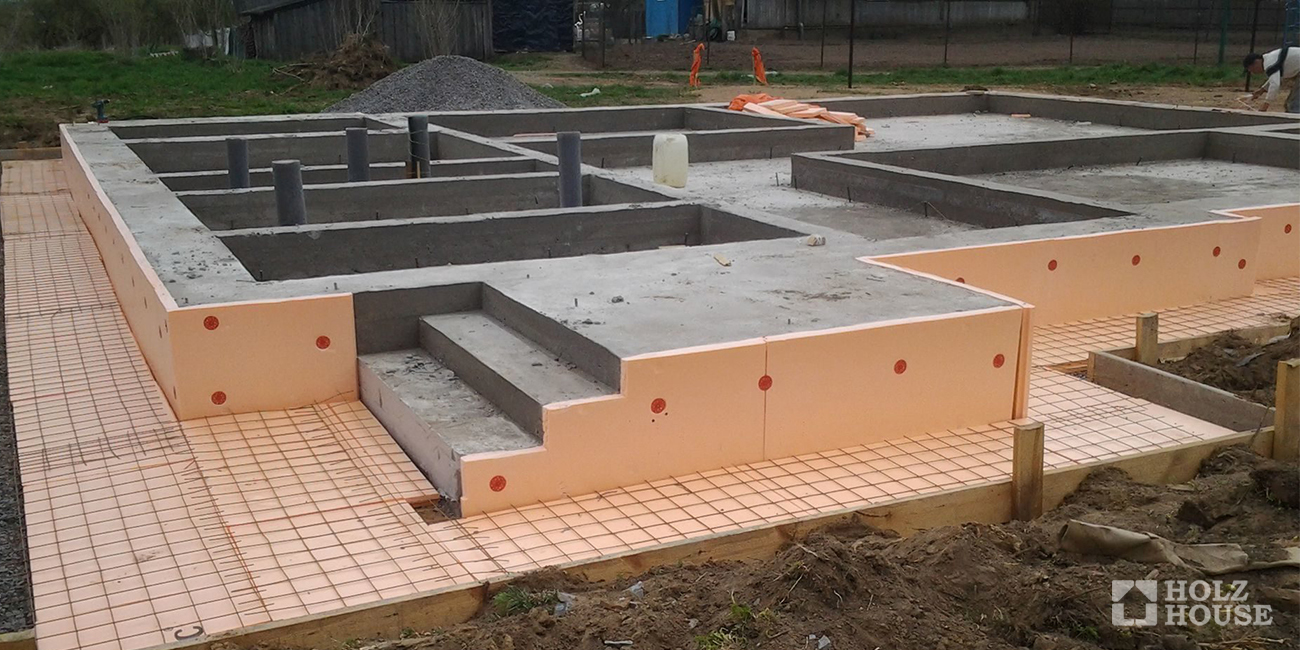 Теплоизоляция. Наиболее эффективным считается заливка фундамента на готовый теплоизоляционный слой. Но возможно утепление по периметру. Основное требование: материал не должен впитывать влагу.