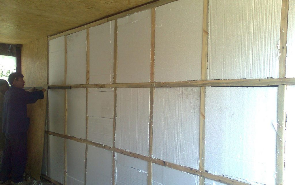 Для утепления деревянных стен снаружи предварительно монтируют обрешетку. В нее закладывают листы пенопласта. В общем виде последовательность действий выглядит следующим образом: