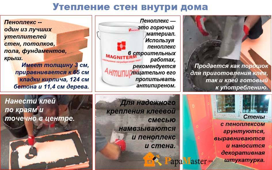 Чаще всего для утепления холодных стен изнутри используют экструдированный пенополистирол Пеноплекс, отличающегося хорошей влагостойкостью, легкой массой. Монтаж теплоизолятора сможет выполнить даже новичок.