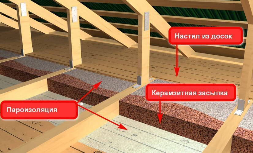 В доме с балочными перекрытиями между черновым и чистовым полом, или потолком и полом второго этажа есть пространство. Высота буферной зоны равняется сечению несущих балок. Керамзит для утепления потолка или пола засыпается именно туда. Три компонента теплоизоляционного пирога: