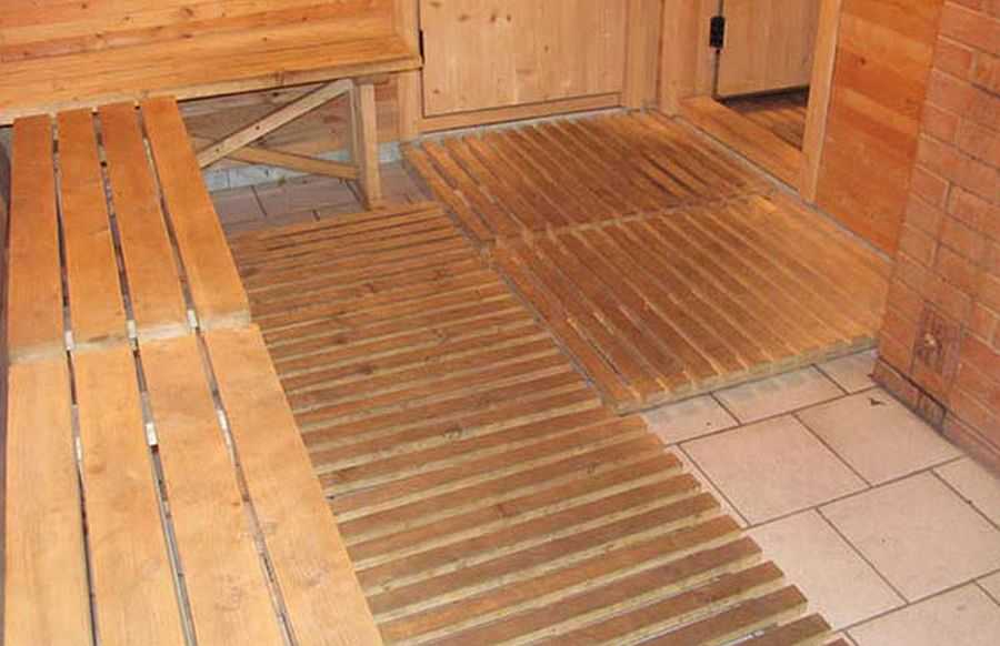 Готовый пол можно накрыть помостом, изготовленным из дерева. После окончания банных процедур его снимают, моют и сушат.
