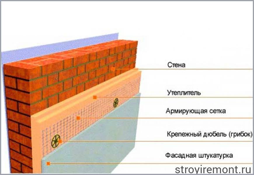 В зависимости от того, каким декоративным материалом будет завершаться отделка, производят финишную обработку утеплителя. Под плитку или обои наносят армирующую штукатурку, затем укладывают армирующую сетку, снова штукатурят (второй слой — не менее 3 мм) и шпаклюют.
