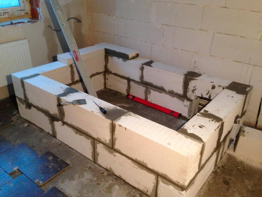 В этом варианте предлагается чашу ванны сделать самому, выложив ее стенки из кирпича.