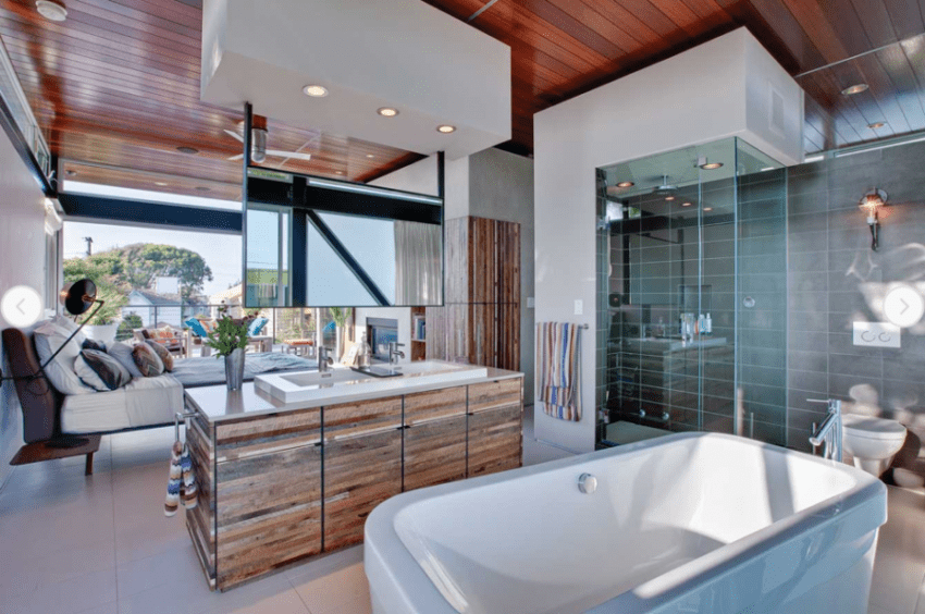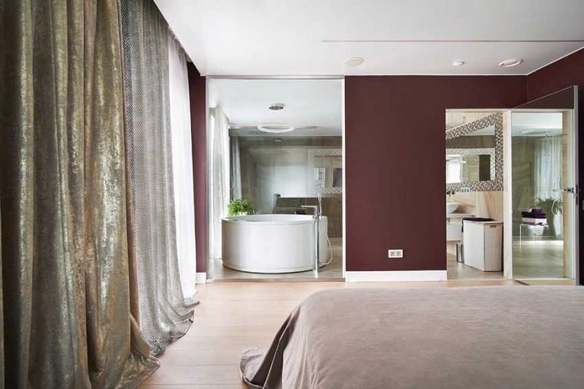 Это наиболее практичный вариант. При расположении ванны в отдельном помещении спальная зона защищена от влаги. Для отделения комнат используют двери, декоративные или стеклянные перегородки, плотные шторы. Первые больше всего защищают сухое помещение от повышенной влажности.