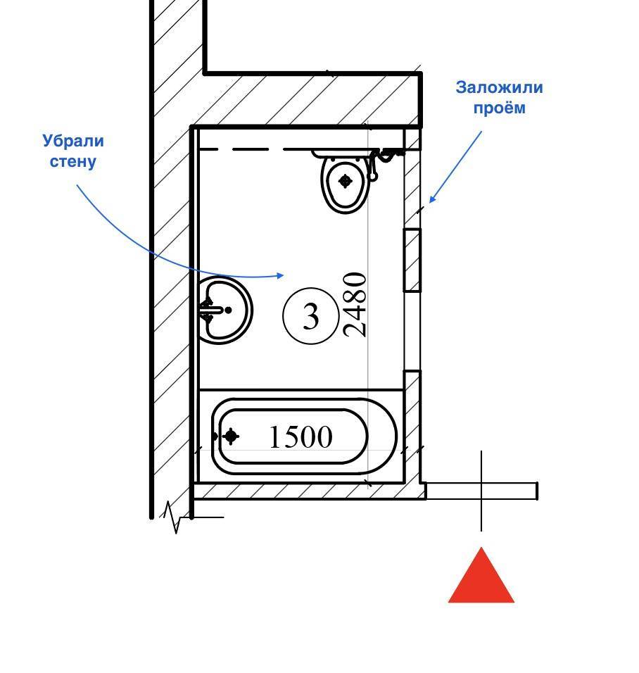 План объединения ванной и санузла в квартире, после перепланировки.