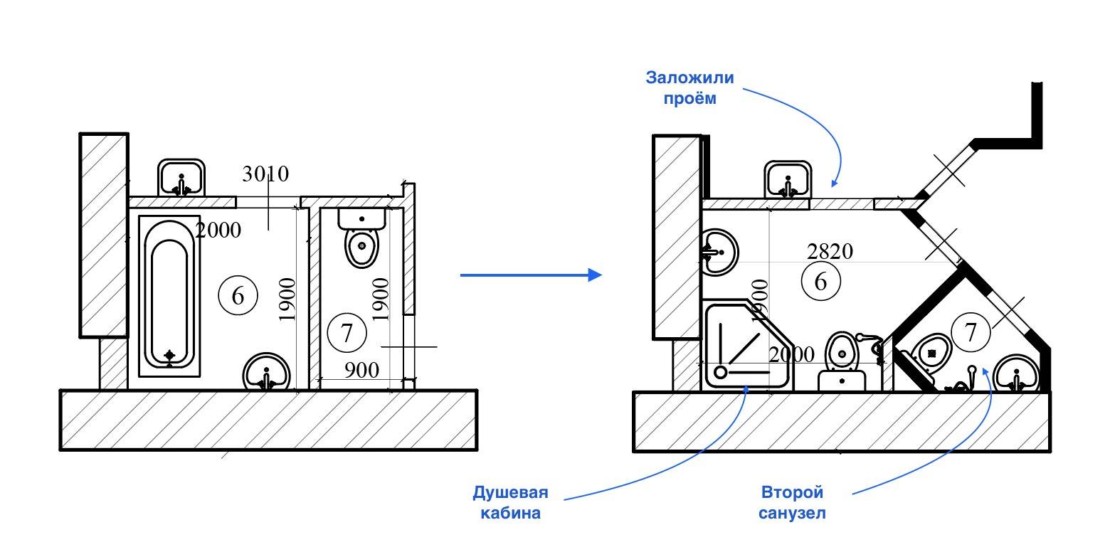 Слева санузел до перепланировки, справа после.