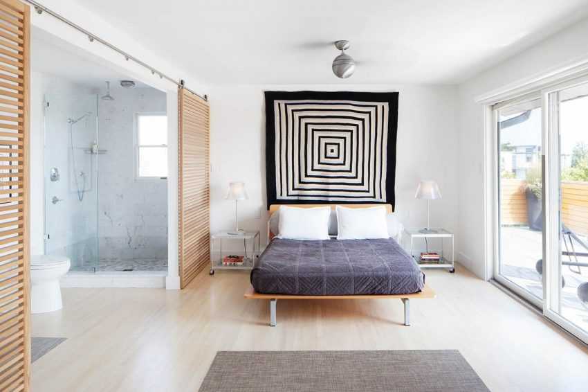 Чтобы совместить спальню с ванной или гардеробной, необходимо предусмотреть защиту от чрезмерной влажности и горячего воздуха. Обычная дверь, даже очень узкая, здесь не пойдет. Необходимо использовать специальную дверь, так называемую сантехнику. Он будет отличаться по следующим параметрам: