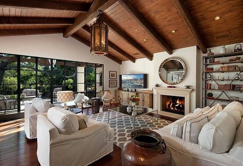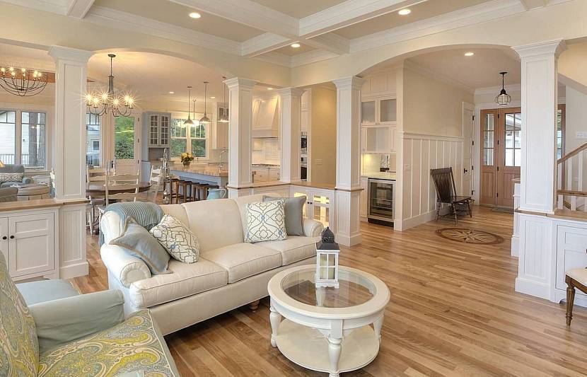 Американский стиль предпочитает простую форму потолка. Поверхность под побелку или покраску дополняет геометрическая лепнина. В просторной гостиной и на кухне используют потолочные балки. Декоративные элементы подчеркивают размеры помещения, помогают разделить пространство на функциональные зоны.
