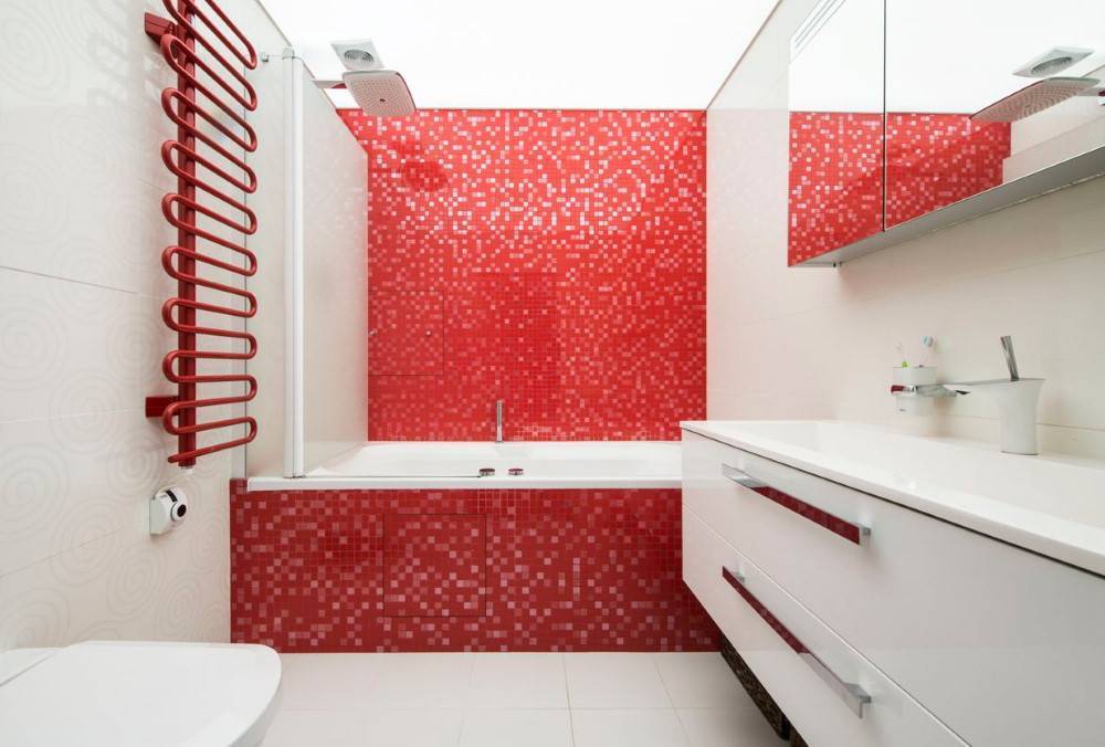 При использовании насыщенных оттенков в компактной ванной необходимо в качестве фона выбирать нейтральные цвета. Выигрышный вариант оформления одной стены ярким цветом (оранжевый, фиолетовый, зеленый). Оригинальны стены, отделанные красными плитами с добавлением оливковых и белых блоков.
