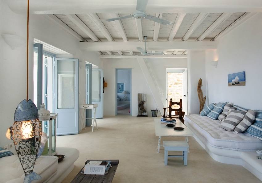Возможен вариант отделки стен и потолка белой краской – это в духе средиземноморского стиля греческой направленности.