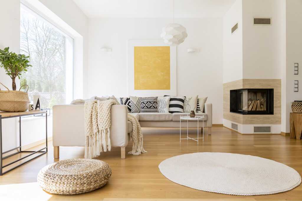 При отделке дома в стиле минимализм можно сочетать разные материалы: пластик, стекло, дерево, пробку, мрамор, керамику, камень. Мы рекомендуем выбирать либо светлые, либо очень тёмные оттенки для пола. Идеальный вариант – паркет без узора, наливной пол или плитка.