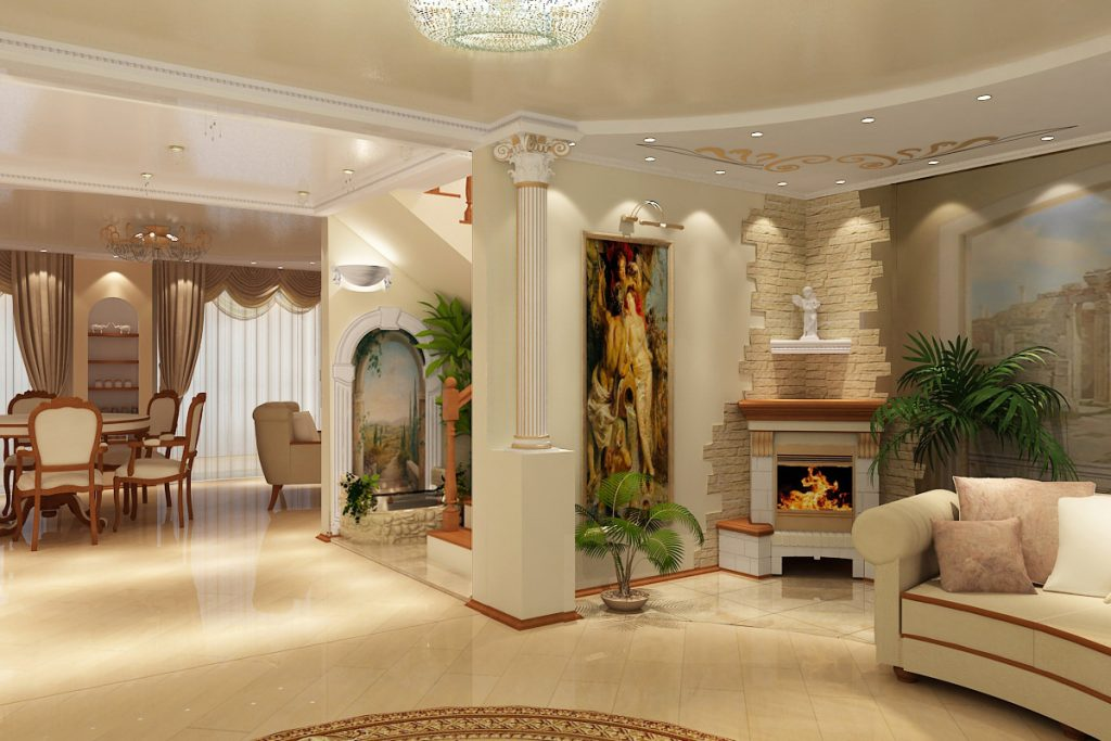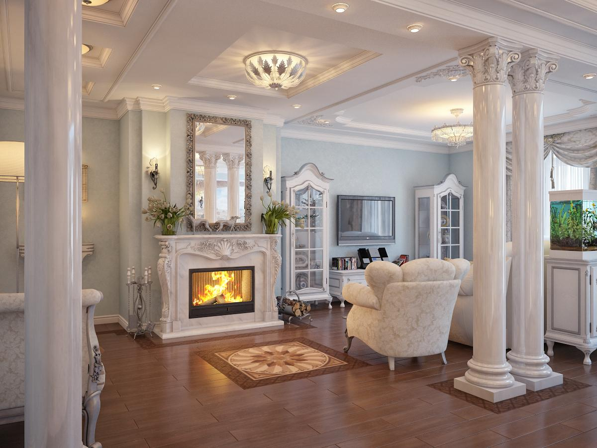 Колонны, пилястры ─ необходимая деталь выбранного интерьера. Элементы добавят аристократичного лоска, усилят ощущение простора. Кроме того, элементы задают тон всему декору, главной задачей которого выступает усиление ощущения высоты потолков, благодаря вертикальной направленности декоративных сооружений. Высокие потолки предполагают роскошные люстры, меандровые орнаменты подчеркнут высоту комнаты. Колоннами выделяют вход, подчеркивают величину зеркал.