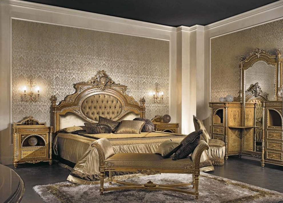 Кровать является основной мебелью и все внимание должно быть сосредоточено на ней, поэтому ее размещают на подиуме. Другая крупная мебель или украшения, таких как скульптуры, в спальне не желательны. В качестве дополнений в помещение ставят небольшой резной комод, зеркало, украшенное инкрустированной рамой. Для освещения подойдут настенные канделябры. Завершат образ тюлевые занавески с интересной драпировкой