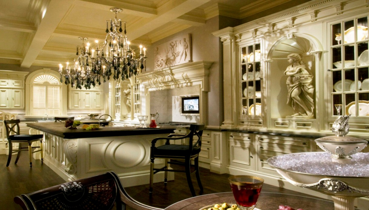 Из мебели подойдет кухонный гарнитур с рабочей поверхностью под мрамор, резьбой и зеркальными вставками. Пол лучше выполнять контрастным по отношению к другим помещениям дома.
