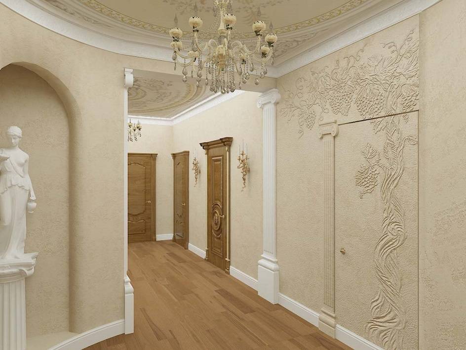 Прихожую можно оформить в двух-трех тонах, сочетая светлые и темные оттенки. Для придания пространству объема в стенах делат ниши. В качестве декорирующих элементов используют скульптуры и настенные фрески. Освещается помещение люстрами, настенными светильниками.