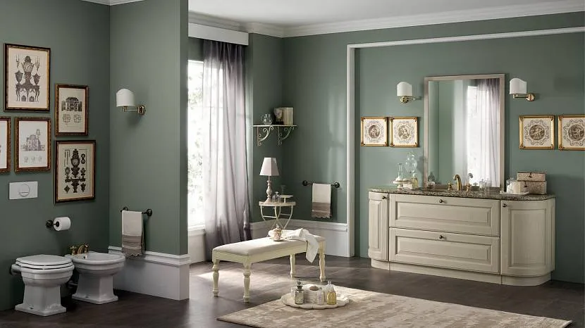 Оформление классической ванной в оливковом оттенкеИсточник scavolini.com.ru