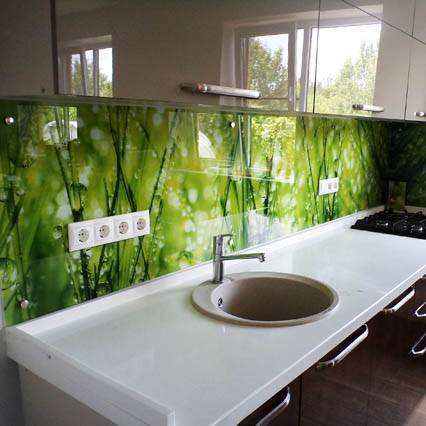 - стекло (прозрачное или окрашенное) — тоже один из вариантов отделки рабочей зоны.