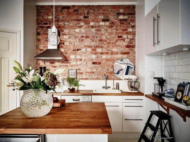- Выделить и обыграть рабочую поверхность. Создать красивую рабочую поверхность, оформить её маленькой плиткой, сделать имитацию кирпичной кладки или другие акцентные детали.