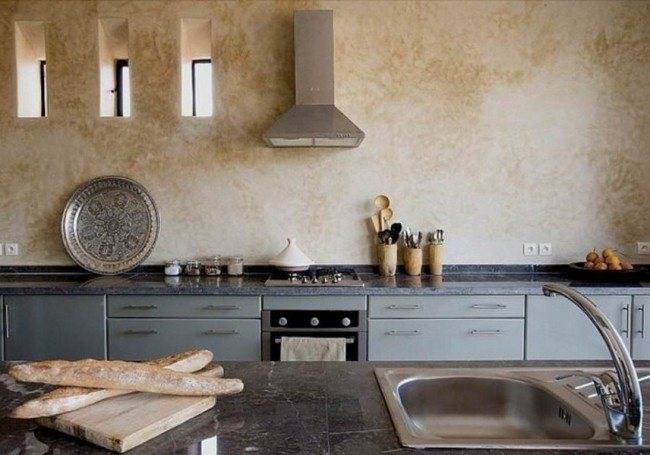 Штукатурка хорошо подходит для оформления кухни, так как устойчива к возгоранию, не боится воды и экологична — в ней нет никаких опасных для здоровья человека примесей.