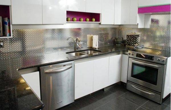 Новейшая идея, которая пришла в голову дизайнерам. Подходит для дорогих интерьеров в современном стиле, к примеру хай-тек. Обычно металлическая панель закрывает зону готовки, становясь главным акцентом помещения.