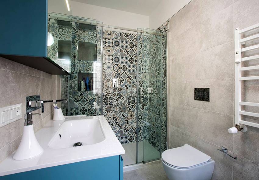 Все перегородки, кроме стеклянных, обклеивают керамической плиткой. Перед наклейкой плитки поверхность перегородки рекомендуется загрунтовать составом, повышающим влагостойкость.