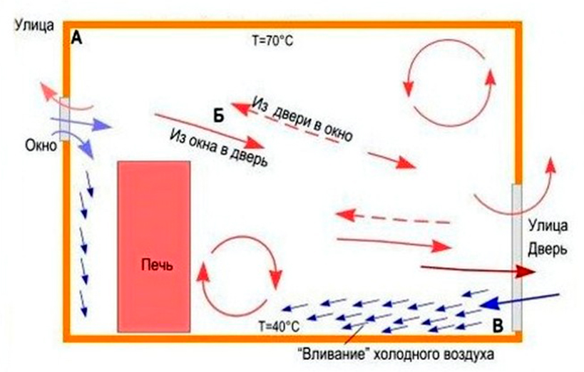 Последний, перемещаясь по комнате, остывает и опускается, затем затягивается в поддувало и устремляется в дымоходную трубу. Так осуществляется вентиляция комнаты.