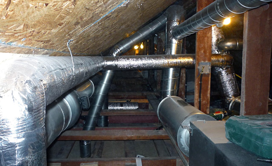 Это касается также отрезков каналов, проходящих через необогреваемые помещения, например чердаки. Стоит утеплить и каналы, находящиеся над поверхностью крыши. Это защитит от ослабления тяги и от конденсирования влаги из выдуваемого воздуха на внутренней поверхности каналов.