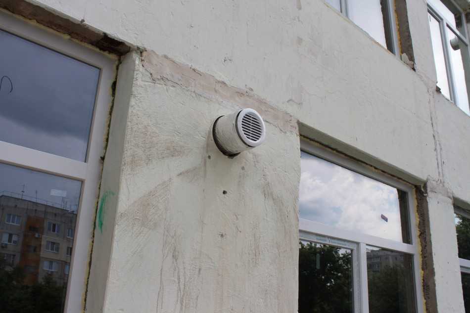 После того, как закреплены все трубы внутри дома, перфоратором делается отверстие притока и заборник воздуха. Для защиты от насекомых на него устанавливается сетка и небольшой навес от непогоды. Хотя отверстие и должно быть ниже вытяжного, но не стоит его монтировать на уровне ближе 2 метров от земли.