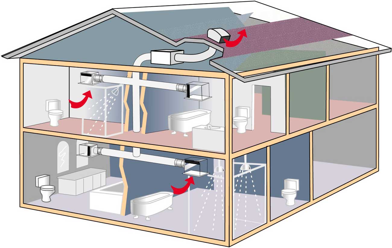 - Принудительная вытяжная. Такая система вентиляции двухэтажного дома совмещается с естественной. Поступление воздуха может осуществляться при помощи установки специальных клапанов или естественным способом, а удаление воздуха из помещений происходит в принудительном порядке. Для этого в ванной комнате или туалете монтируются вытяжные вентиляторы принудительного типа. Работу такой системы можно автоматизировать.