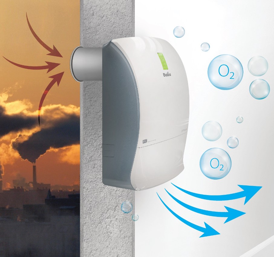 Свежий воздух поступает в корпус через воздухозаборники, там охлаждается летом и прогревается зимой, и через вентиляционные каналы поступает в помещение. Отработанный воздух выпускается из каналов обратно в корпус устройства, там он отдает тепло, и затем удаляется из здания.