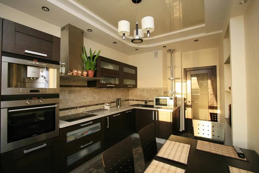 - Трубы воздуховода допустимо спрятать под натяжным или многоуровневым потолком. С этой целью нужно собрать короб из листов гипсокартона – он прекрасно скроет всю систему. Однако к такому способу можно обращаться, только если на кухне планируется серьезный ремонт с полной заменой потолочного основания. Если же вытяжка ставится после завершения отделочных работ, то скрыть ее под указанными сооружениями удастся едва ли.