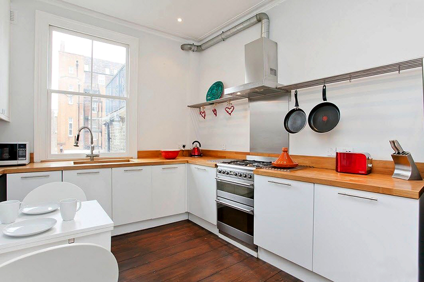 Кухня с вентиляционным коробом по центру может быть обыграна при помощи заказа дополнительного фурнитура, который скроет все технические сооружения и дополнительно добавить место для хранения кухонных мелочей. Дизайн кухни с вентиляционным коробом в углу, так же позволяет сделать выбор между кардинальным скрытием (гипсокартонном) либо при помощи специальной полки.