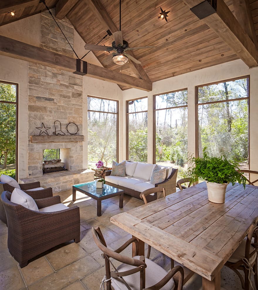 Часто в качестве элемента декора используют камин. Это тоже функциональное решение для украшения веранды, что не может не радовать. Конечно же, в случае установки камина, хорошо поставить напротив него удобное кресло и наслаждаться огненным пламенем.