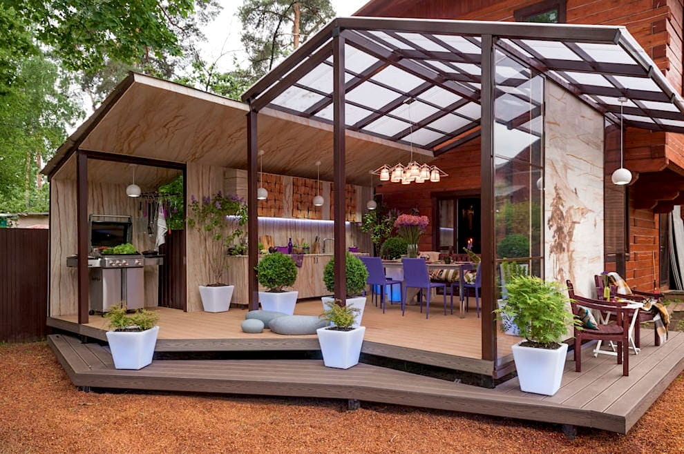 Открытые террасы. Открытые террасы являются полною противоположность закрытых террас. Они отлично подходят для чаепитий и приёмов пищи на природе. Ещё такие террасы очень похожи на летние кухни.