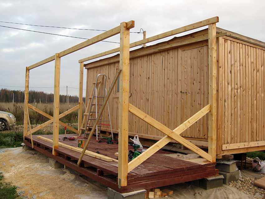 - установите опоры, расстояние между ними зависит от вида конструкции и веса отдельных элементов, они также могут выступать за перила и таким образом поддерживать крышу.