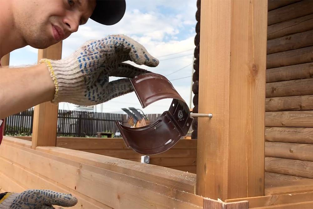 Пришлось частично разобрать крышу козырька, сняв один лист металлочерепицы, и доступ стал получше. Прикрутил необходимые скобы и вернул все на место.