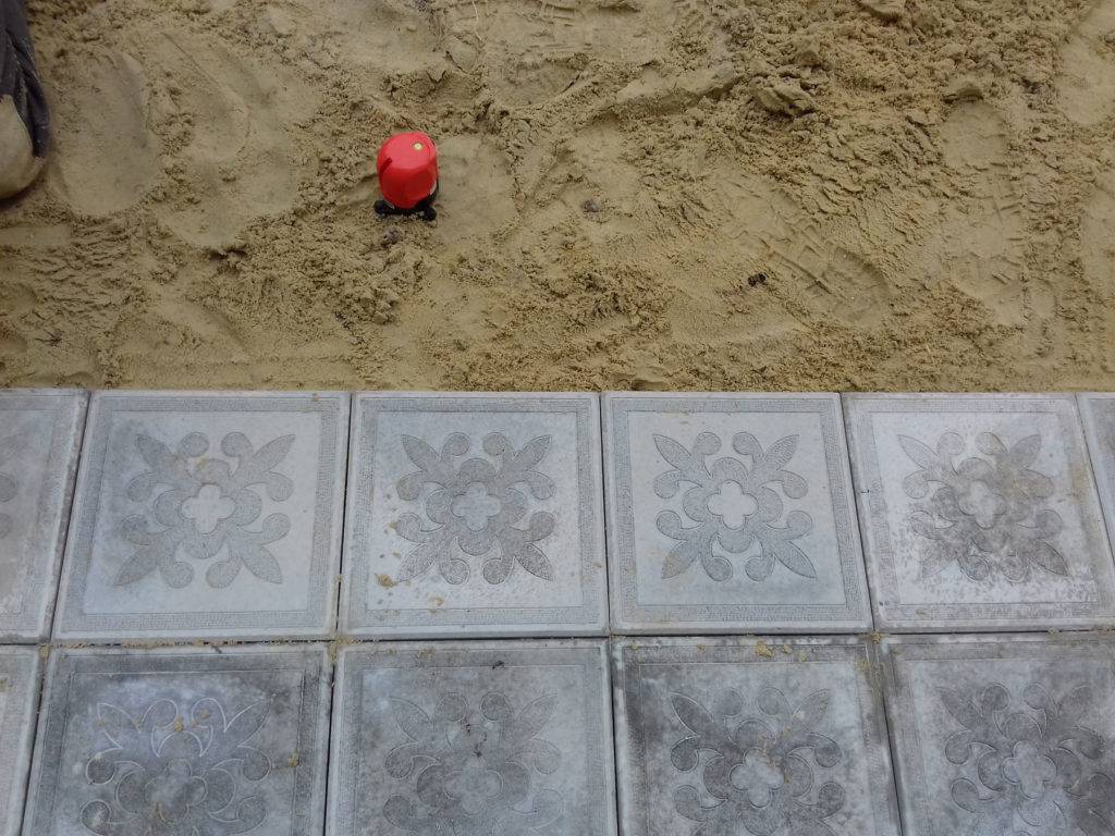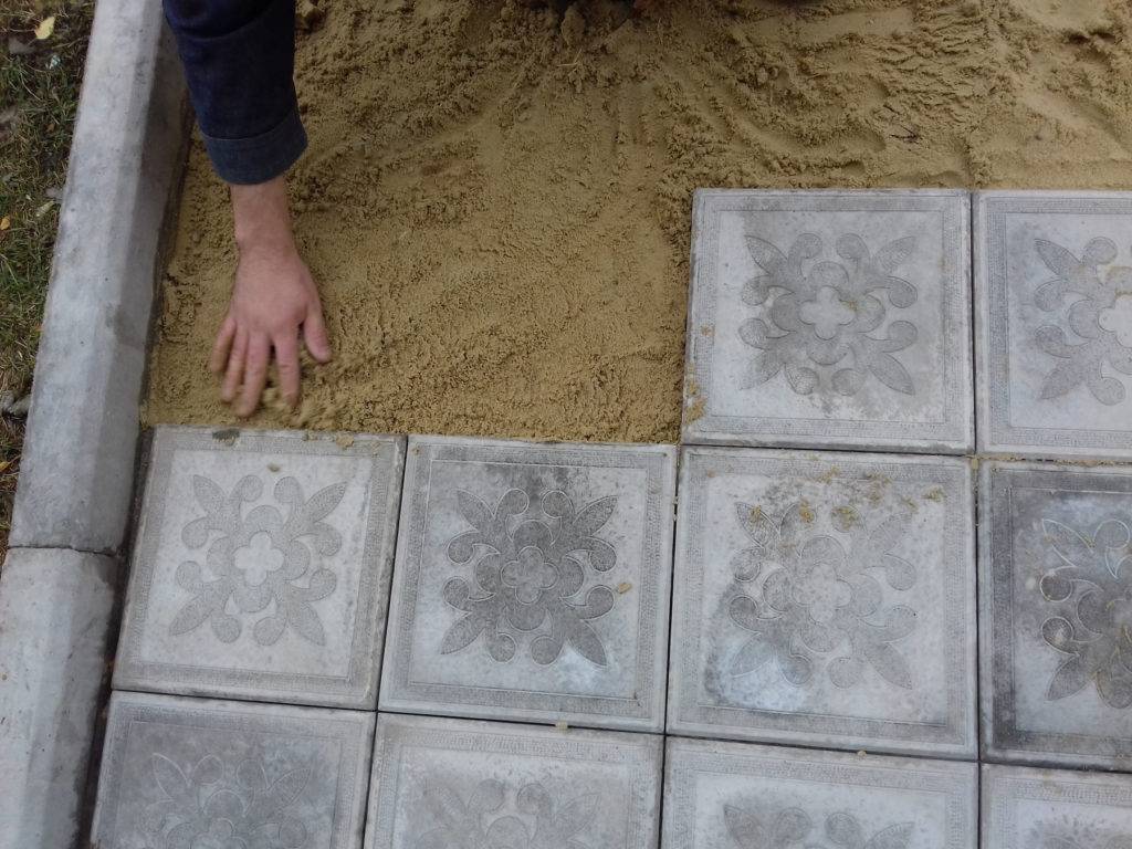 При необходимости добавить песок в те места, где при трамбовке он просел ниже уровня. Если песок слишком сухой, его нужно смочить водой для лучшего прессования. Когда песок будет утрамбован по всей площади, можно укладывать плитку.
