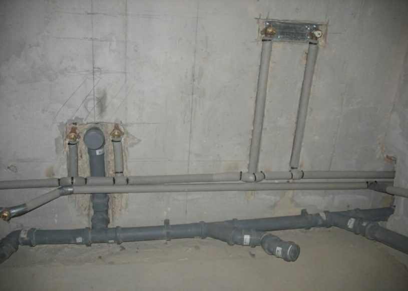Работу начинают с канализации. Лучше для этого использовать пластиковую трубу диаметром 100–120 мм. В фундаменте делают желоб, в который укладывают слив. Ни в коем случае нельзя выводить трубу сквозь стены, она должна опираться на устойчивое основание. Внутри дома стояк крепят с помощью эластичных подвесов, при проходе через стены и перекрытия прорезают отверстия с запасом.