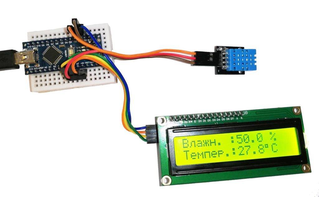 Соединяем железяки проводами, подключаем USB, пару манипуляций с компьютером у вас на дисплее уже видны текущие температура и влажность. Подробнее в отдельной статье.