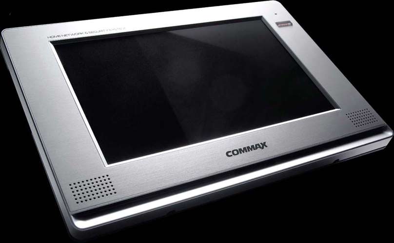 Одной из лучших моделей на сегодня считается видеодомофон от компании COMMAX. Цветная модель выполнена из алюминия и представлена в двух цветах – черном и серебристом. Обладая сенсорной панелью, сам прибор радует своей простотой и оформление. Справа находится кнопка питания, а также возможность регулировки звука. Главный экран переведен на русский язык, что достаточно сильно упрощает управление. Отличием этой модели является возможность подключения сразу четырех видеотрубок, которые могут помочь ответить на звонок или служить вместо стационарного телефона. Также вы можете подключить к ней 4 видеокамеры, что даст вам возможность видеть весь свой участок с разных ракурсов. Цена на данную модель можно посчитать слегка завышенной, но на то он и прибор нового времени.