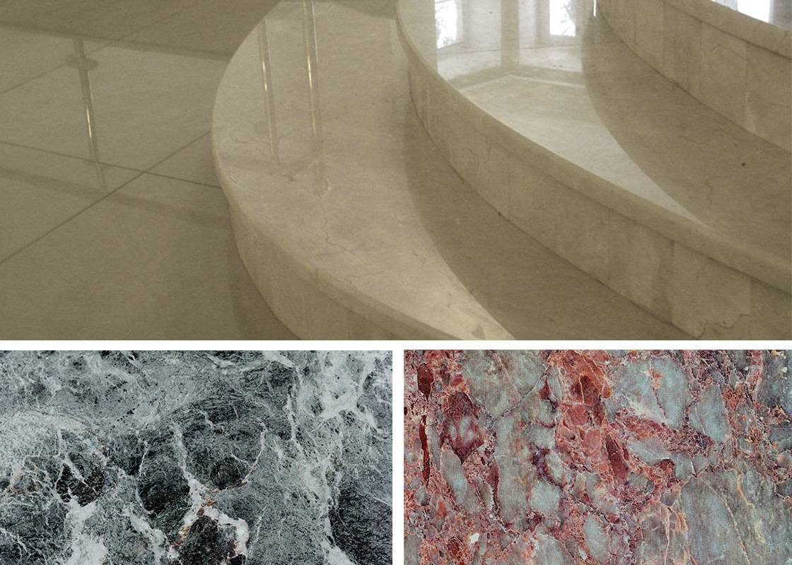 Мрамор часто имеет рисунок — пестрый, пятнистый, свилеватый, муаровый; полировка проявляет рисунок и цвет, шлифовка снижает его яркость и четкость, фактура скалывания скрывает рисунок и осветляет общий фон.