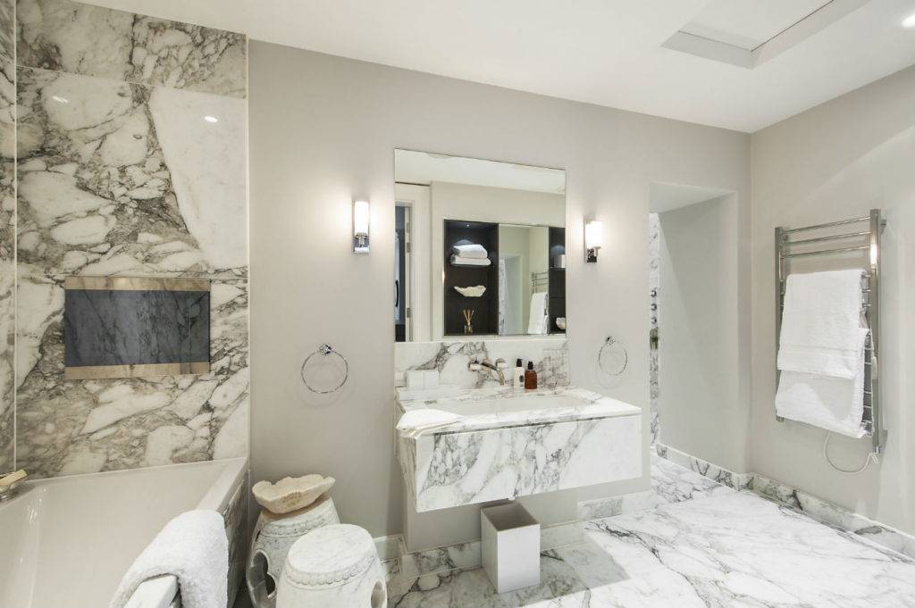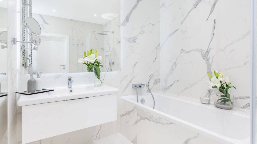 Для любителей шика и помпезности подойдет мраморная отделка ванной. Мрамор – это натуральный камень, который отличается низкой водопоглощаемостью и экологичностью. Мраморные стены в ванной комнате выглядят роскошно и дорого, однако и обойдутся они не дешево.