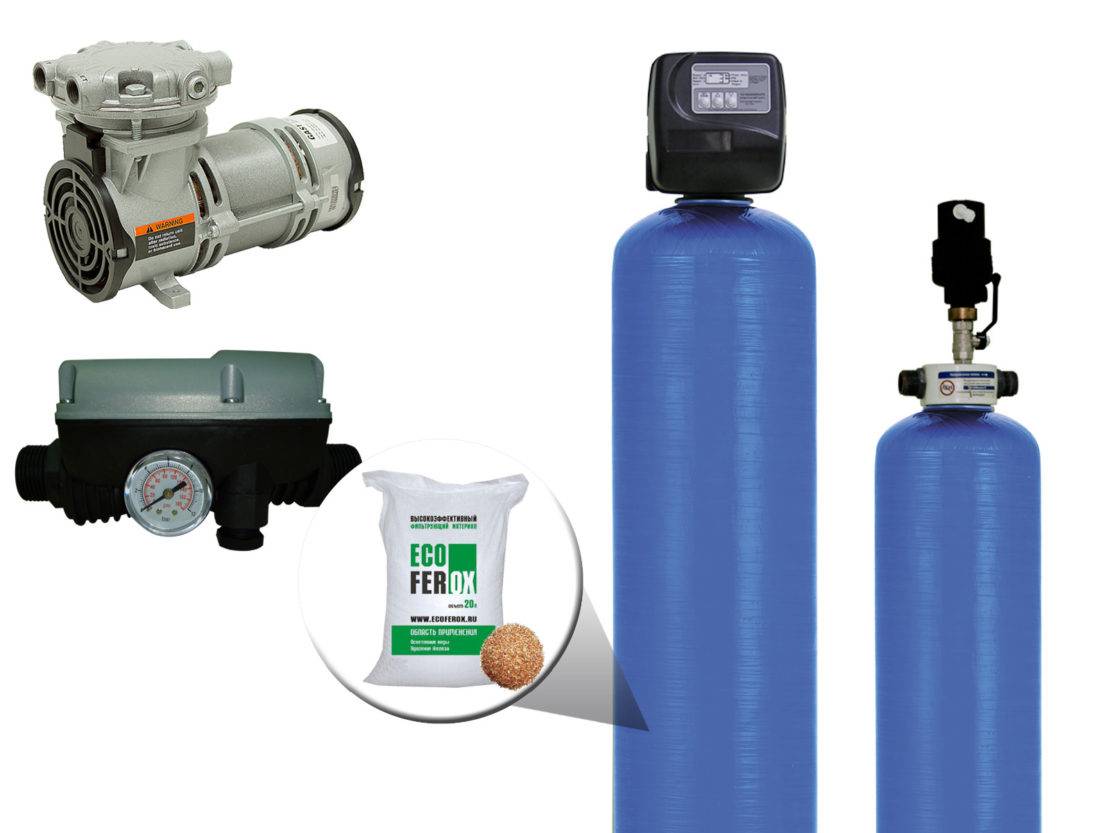 Если содержание железа в воде свыше 5 мг/л (что не редкость для воды из скважин), то для очистки используются фильтры с глауконитовым песком, обогащенным оксидом марганца. Пройдя через фильтрующую среду, служащую катализатором окисления, вода избавляется от железа, марганца и сероводорода, которые выпадают в осадок. Когда такой фильтр засоряется, его требуется промывать растворами, восстанавливающими окислительную способность (раствором перманганата калия). Следует помнить, что при подобном методе очистки вредные химикаты сливаются в канализацию, поэтому его допустимо использовать только при наличии на участке централизованной канализации. Удаление механических загрязнений, марганца, микроорганизмов, кислорода