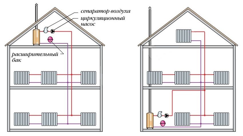 - в системе с верхней разводкой теплоноситель подается, прежде всего, на чердак строения (или под потолок верхнего этажа, в деревянном доме), проходит по магистральным стоякам, далее через радиаторы обогрева отработанная жидкость возвращается в котел подогрева.