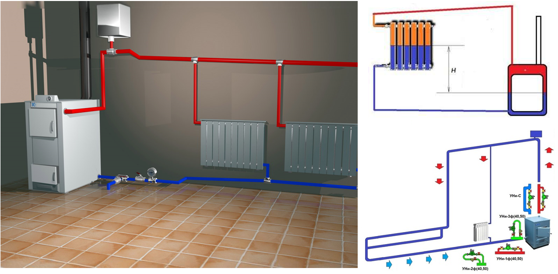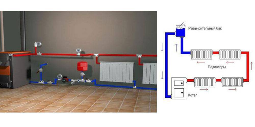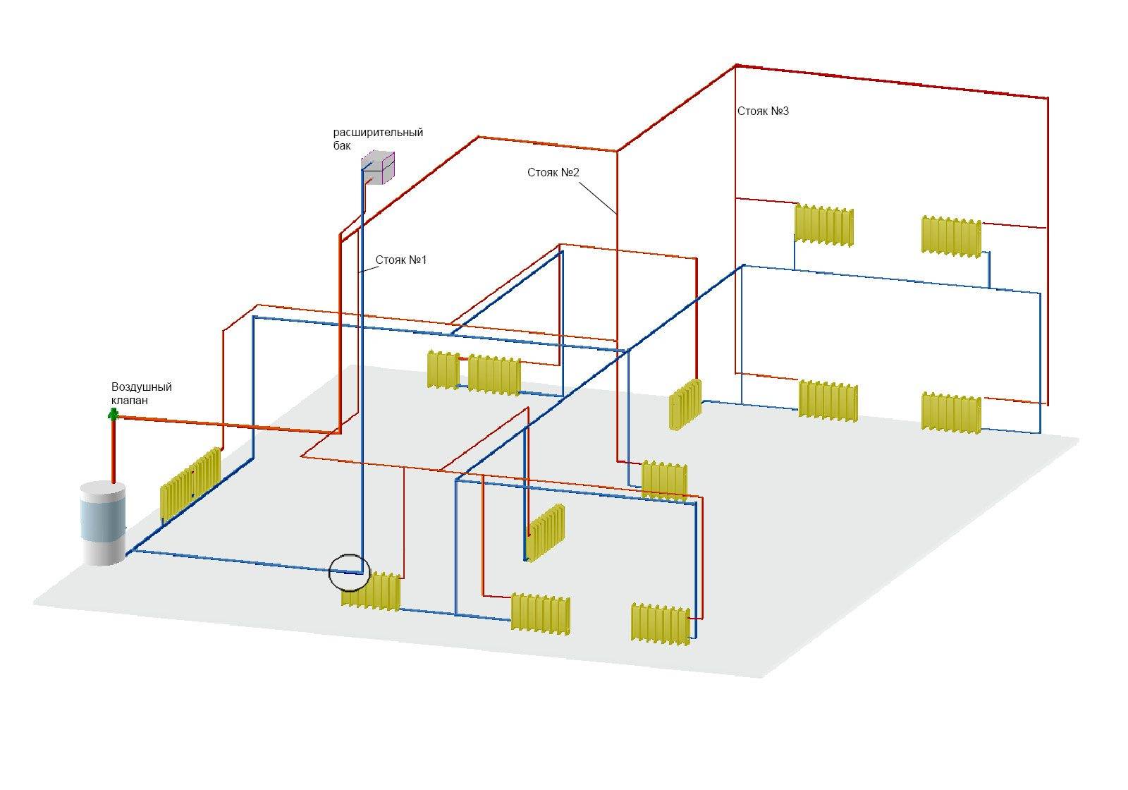 Отличием двухтрубной системы водяного отопления является прокладка цельной трубы к дальнему из радиаторов, от которого делается разветвление к промежуточным приборам отопления. Таким образом, пройдя по всей системе отопления, теплоноситель возвращается в котел по специальной обратной трубе, что позволяет равномерно распределить теплоотдачу по всему помещению.