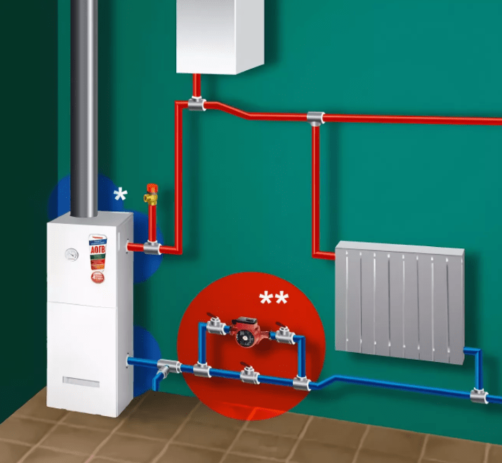 Циркуляционный насос устанавливают на линии «обратки» перед самым котлом. Здесь теплоноситель является наиболее холодным, а значит, насос прослужит дольше.