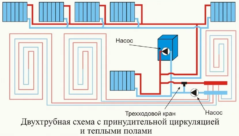 Подключить теплые полы в частном доме можно как к однотрубной, так и двухтрубной системе отопления с насосом. При этом монтируется оборудование чаще всего по следующим схемам: