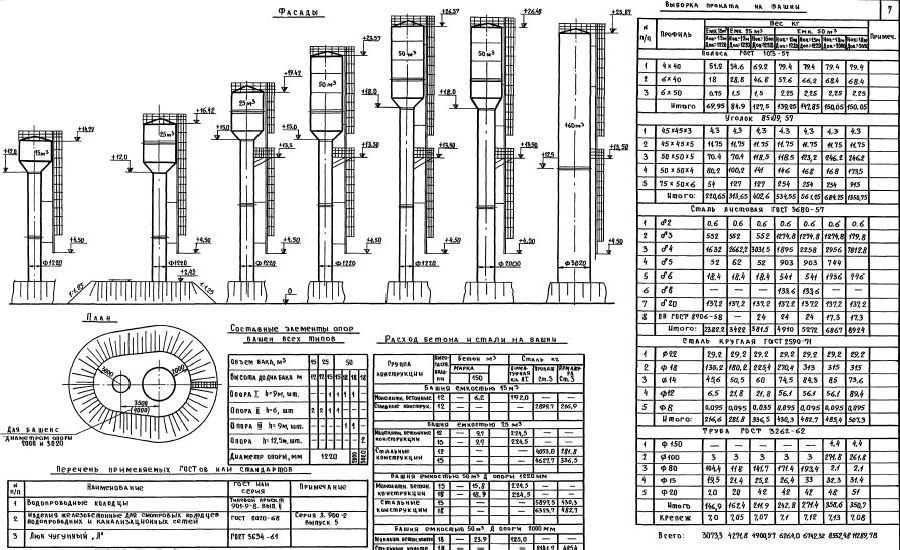В настоящее время используются типовые проекты башен емкостью от 15 до 50 м3, а также башни-колонны 160м3 высотой 25м. В последней используется полезный объем как верхней части, так и цилиндрической опоры. При этом, сооружение не имеет уширения в своей верхней части.