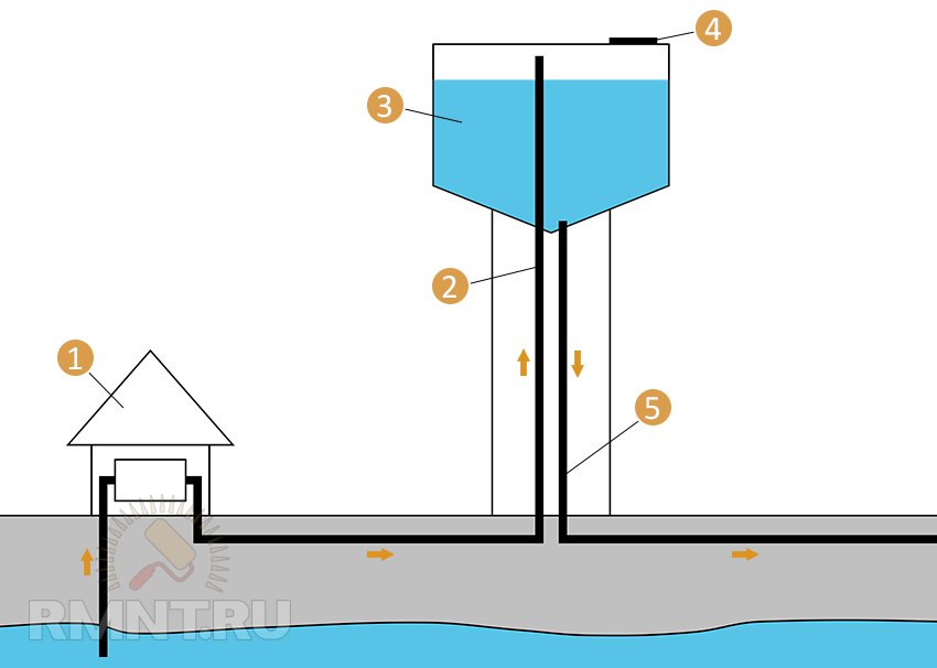 1 — насосная станция с автоматикой; 2 — подающая труба; 3 — резервуар; 4 — вентиляционный люк; 5 — трубопровод подачи воды потребителям